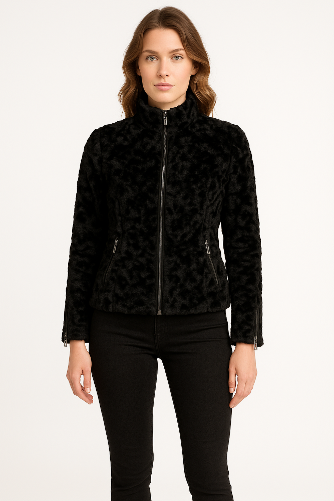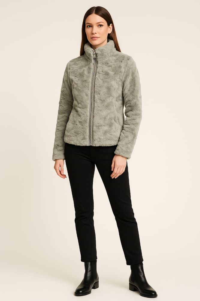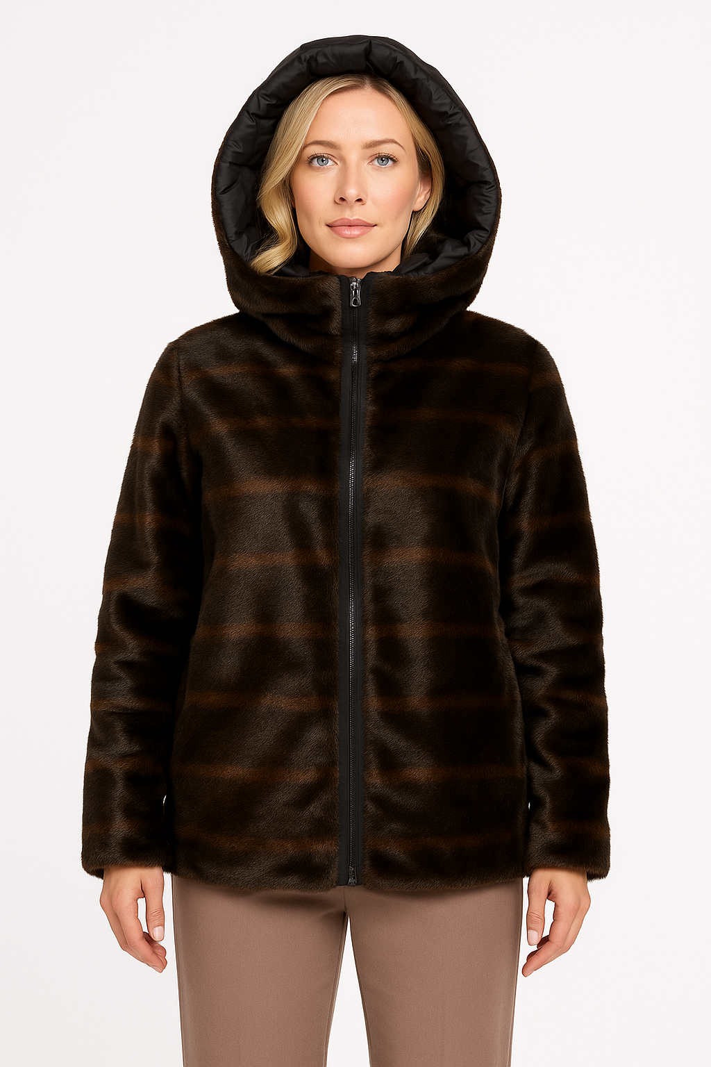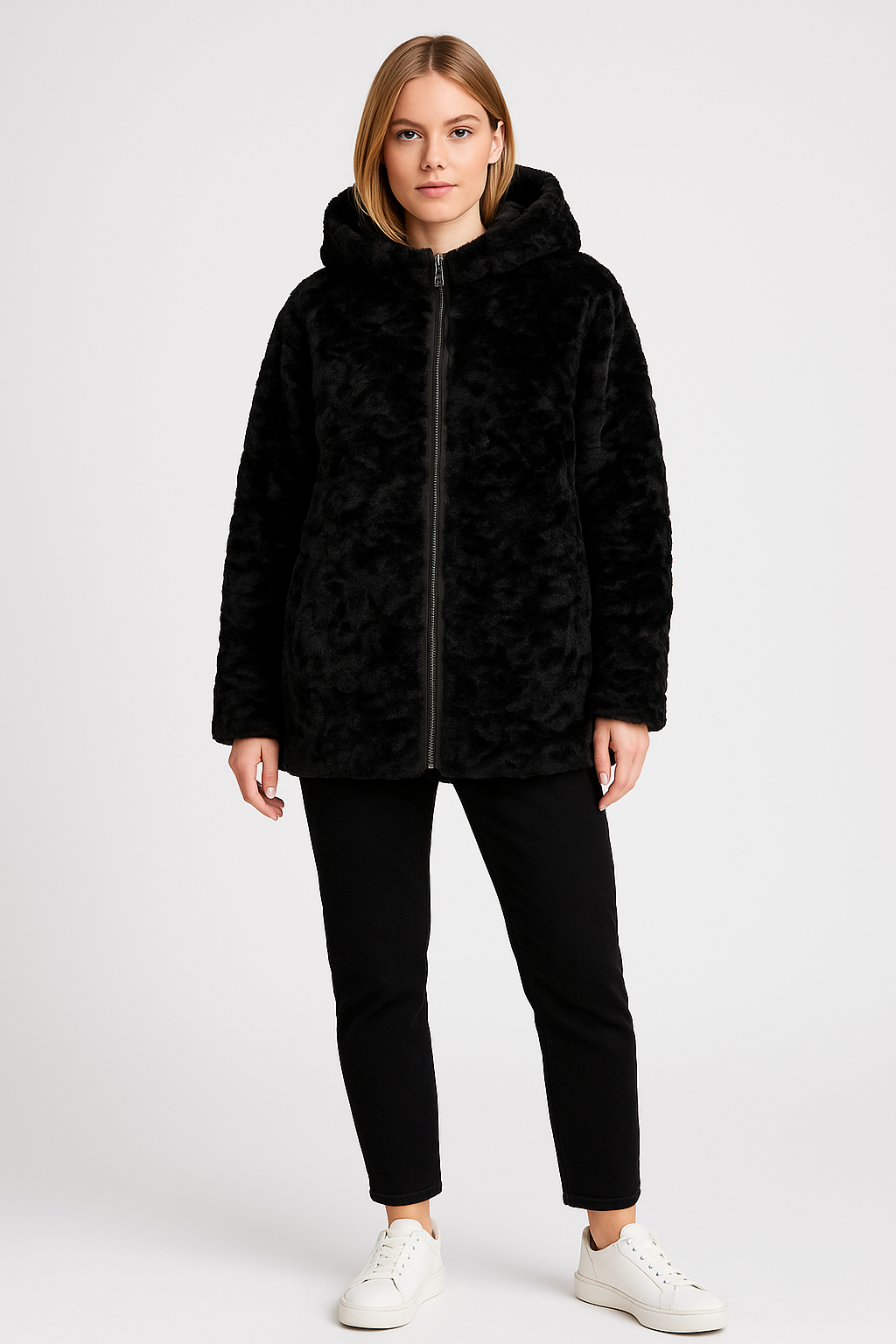 Kurtka z dzianiny futerkowej taliowana z kapturem. Zapinana na keski. Długość 68 cm.