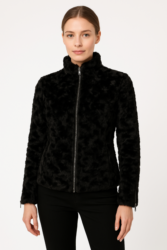 Kurtka wykończona jest stójką nadającą szyku oraz ozdobnymi zamkami na rękawach. Krótsza długość – 62 cm – sprawia, że model świetnie komponuje się zarówno ze spodniami, jak i spódnicą, tworząc elegancką, a zarazem wygodną stylizację na co dzień i specjalne okazje.